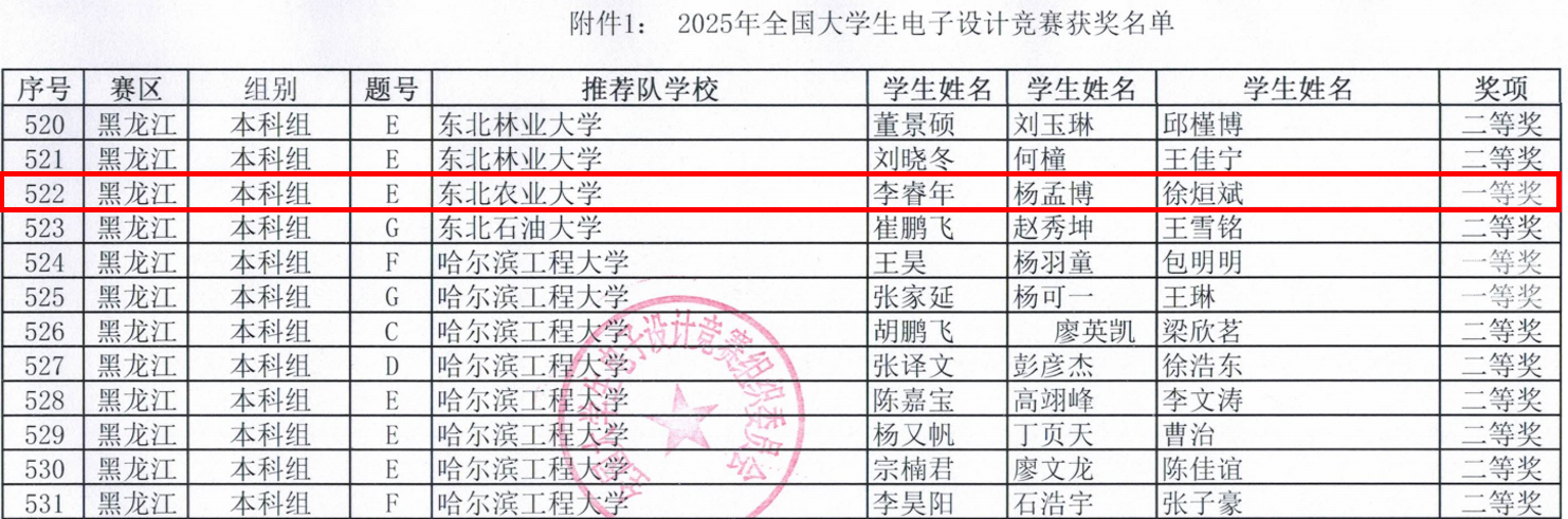 8月29日,在2025年全国大学生电子设计竞赛中,我校参赛的团队表现优异,夺得国家一等奖1项、省级一等奖5项、二等奖9项、三等奖2项。其中,由电气与信息学院教师魏东辉、刘记宇指导,李睿年、杨孟博、徐烜斌团队设计的“简易自行瞄准装置”项目,凭借其创新技术及在智慧农业领域的应用潜力最终赢得了国家级一等奖,实现了我校在该项赛事中的历史性突破。我校荣获优秀组织奖,获奖成果位居黑龙江省高校前列。