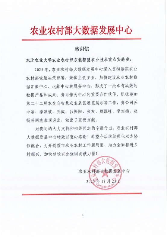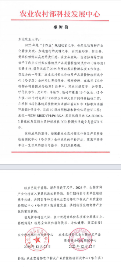 感谢信是一份荣誉,更是一份责任与激励。学校将继续聚焦服务国家重大需求,不断提升科研服务水平,为加快建设农业强国贡献更多的“东农智慧”与“东农力量”。