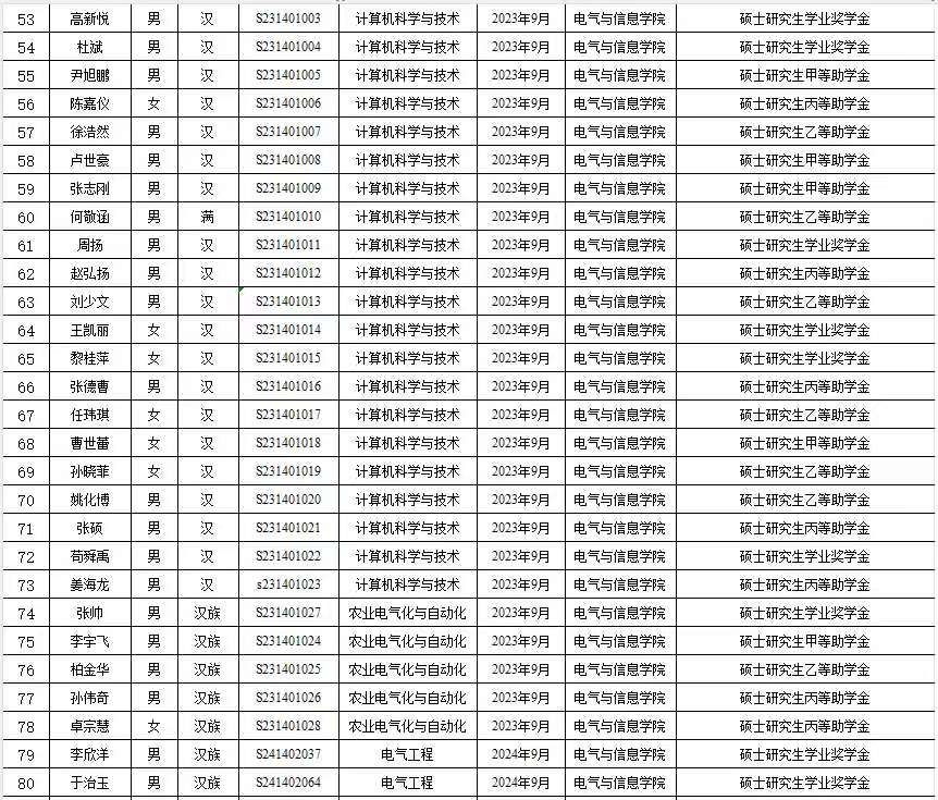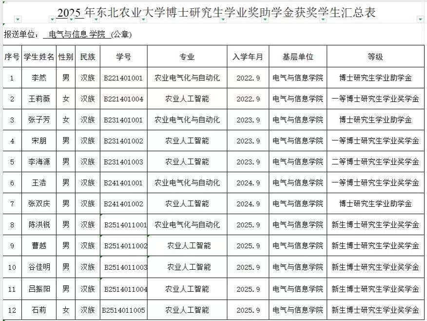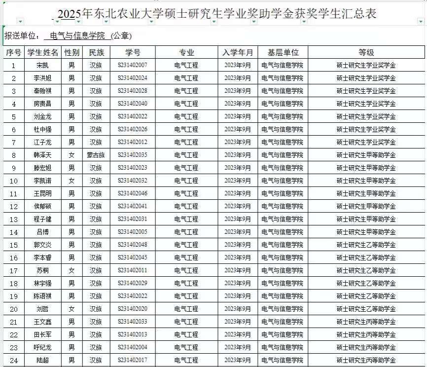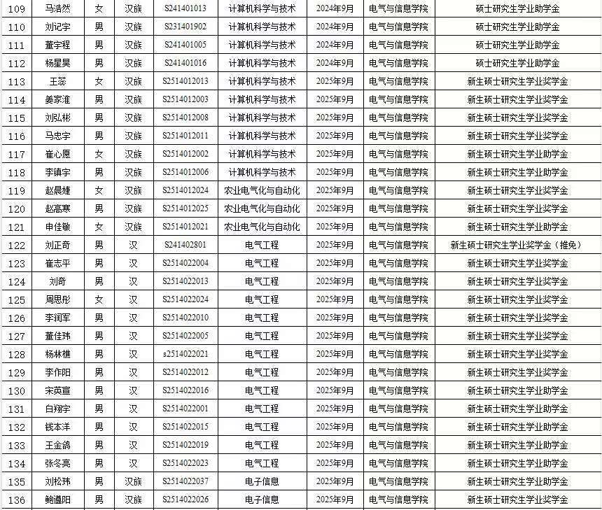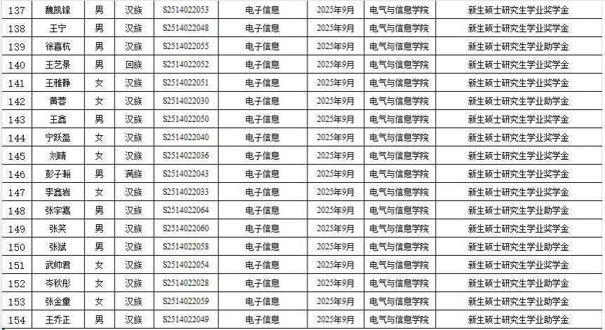 根据《关于开展2025年研究生学业奖助学金评审工作的通知》相关要求,按照《电气与信息学院2025年研究生学业奖助学金评审细则》,经个人申请、审核评分,现将研究生学业奖助学金名单进行公示,对以下人选如有异议,可在公示期内反映,反映情况和问题必须实事求是,应签署或告知真实姓名、所在单位和联系方式;对线索不清的匿名信和匿名电话,公示期间不予受理。