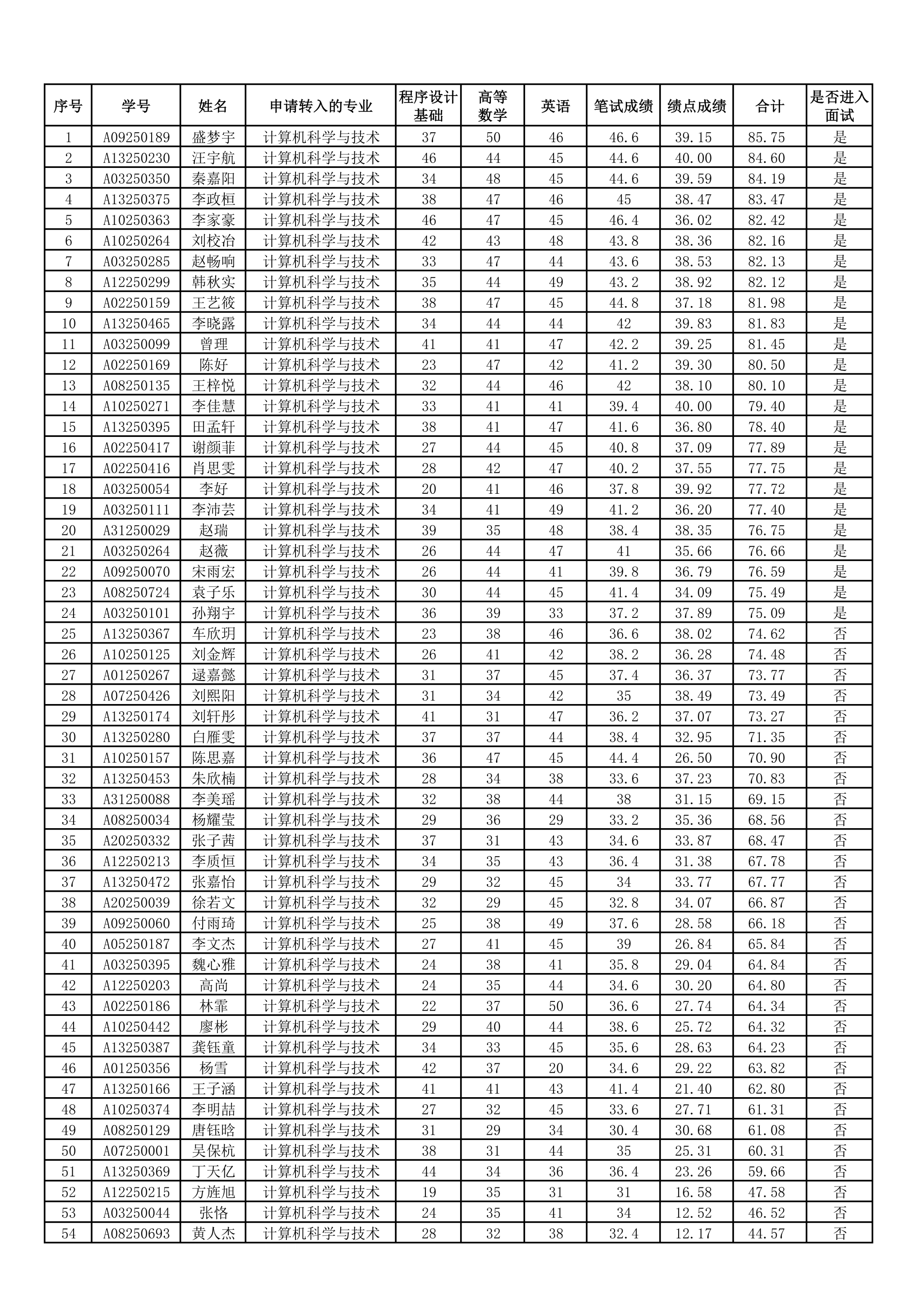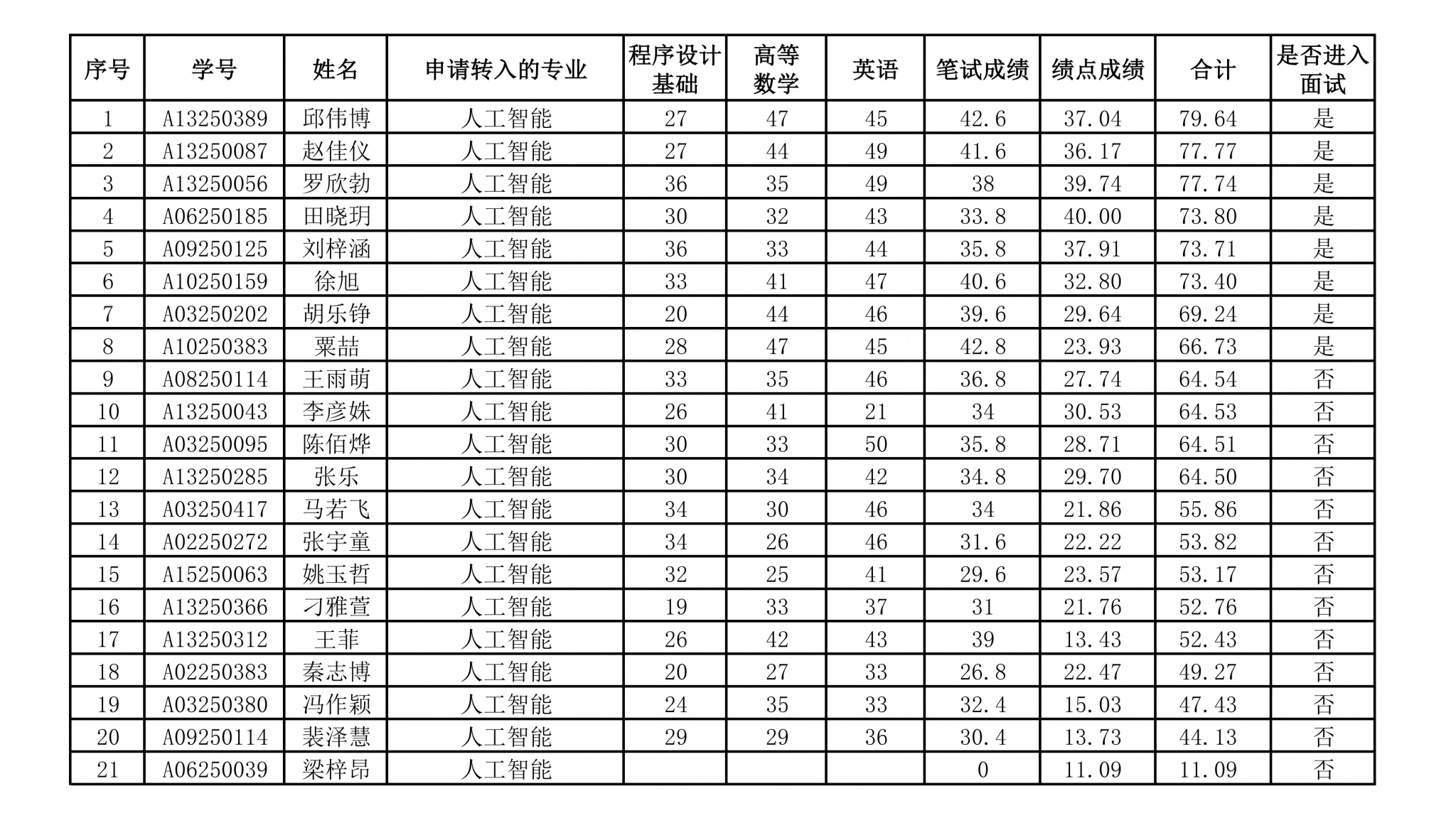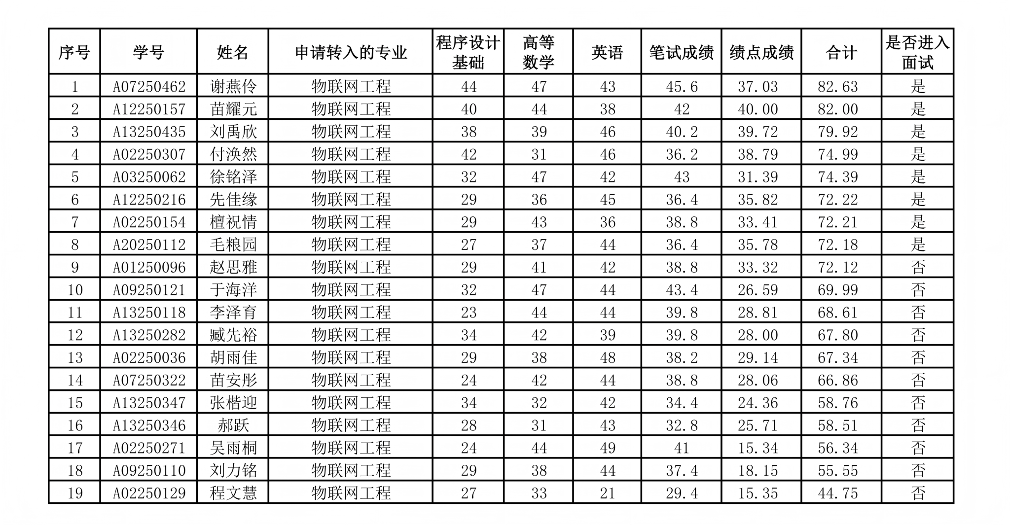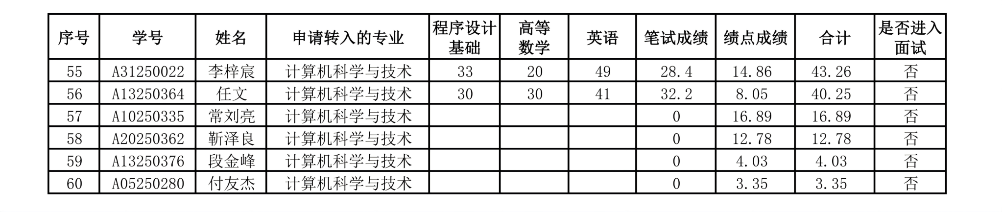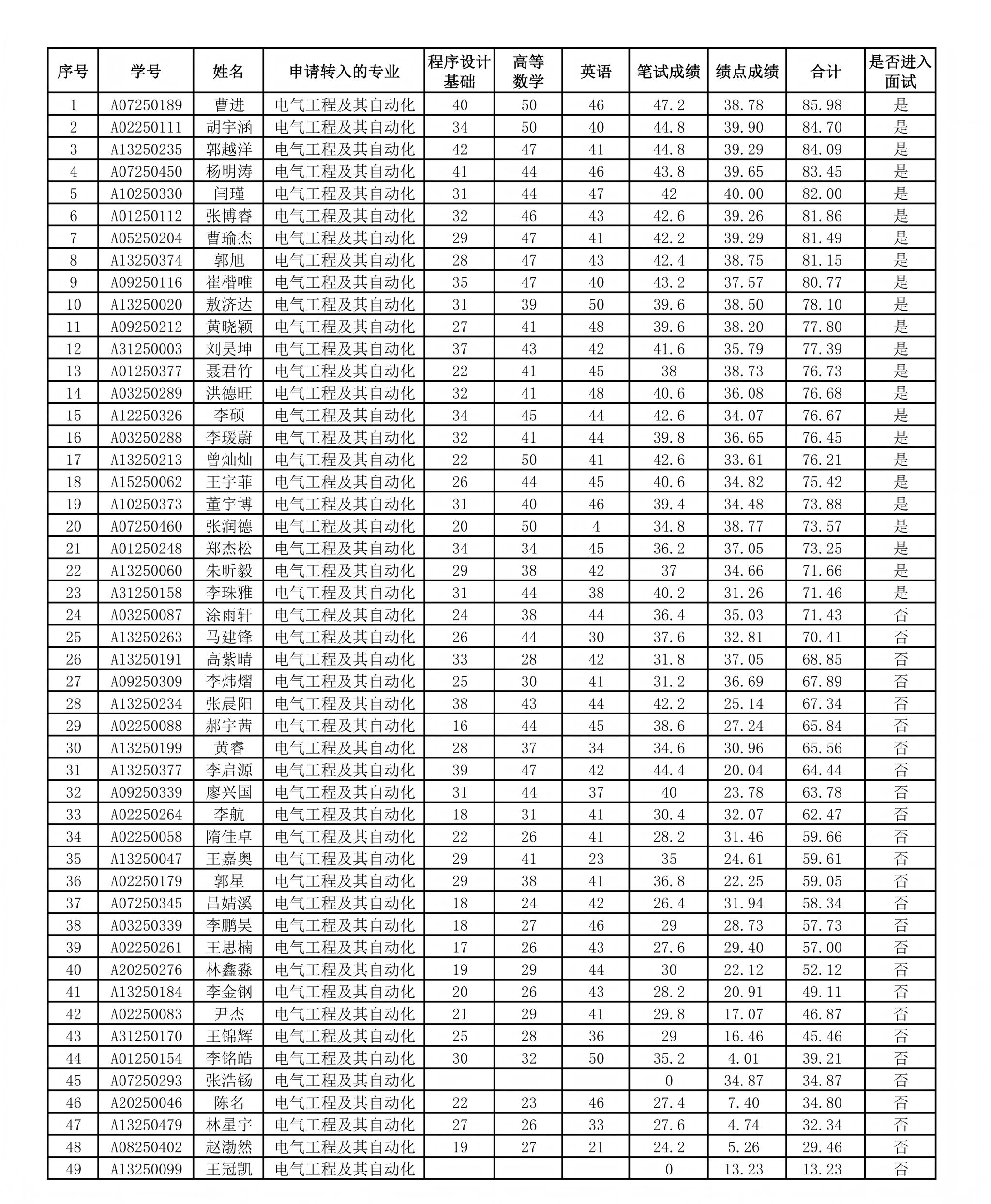 根据东北农业大学教务处《关于开展2025级本科生集中转专业的通知》《电气与信息学院本科生集中考核转专业实施细则》要求,经学生自愿报名、资格审查、笔试等程序,现将申请转入电气与信息学院相关专业的学生学分绩点、笔试成绩及面试名单公布如下。
