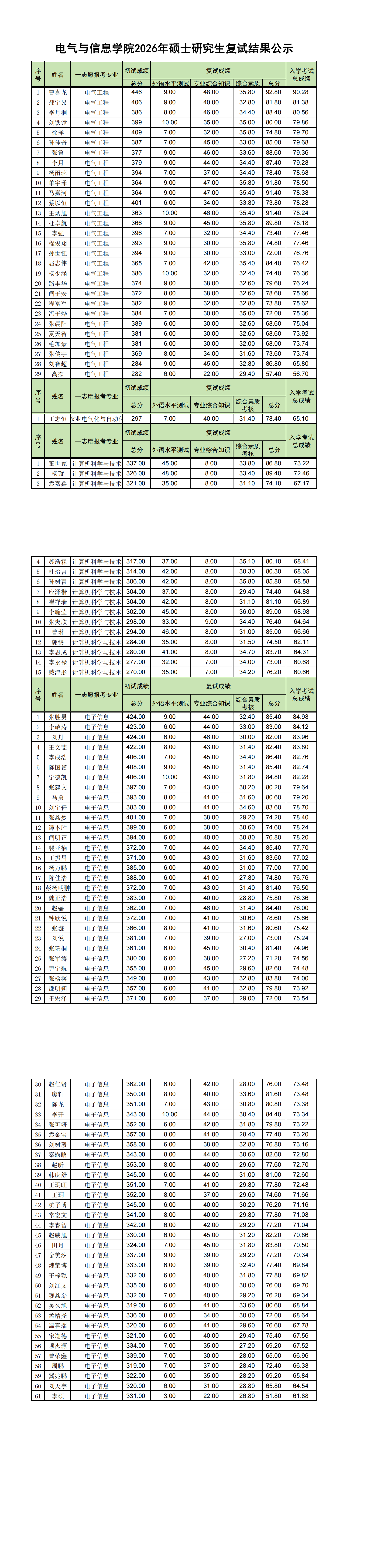 电气与信息学院2026年硕士研究生复试结果公示如下: